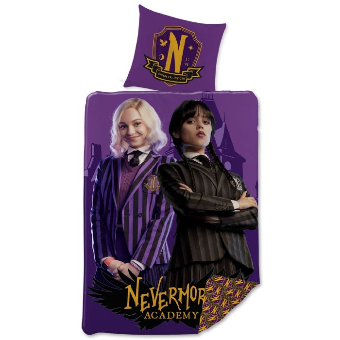 Sengesæt med Wednesday fra den kendte serie på Netflix. Et stort hit blandt unge og teenagere. Sengesættet er vendbart. På forsiden ses et stort billede af Wednesday og hendes bedste veninde Enid, hvor bagsiden er med et all-over print af logo. Drøm dig ind i den magiske og forunderlige verden, med dette seje sengetøj.